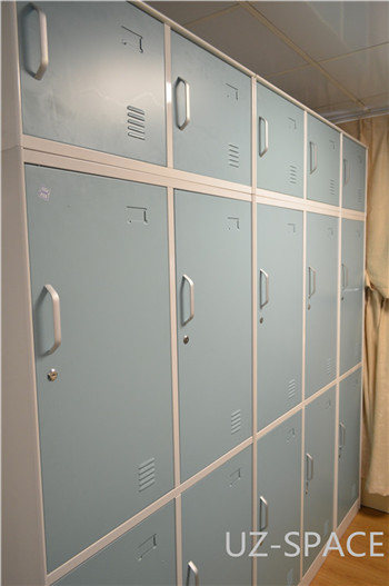 | 12 | 钢制救生衣箱(在衣柜上方) | UZ-ST-JSYG0450-500LB | 优泽空间 | 450x500x500 | 采用上海宝钢优质一级冷轧钢板,钢板厚度0.8mm,符合 CB3233-84 CBT3483-93标准。半成品经氩弧焊和高频点焊或脉冲焊接组装后,进入大型喷涂生产线,并经酸洗、中和、磷化处理后,进行环氧树酯静电粉末喷涂,涂层厚度实测值为70-80微米,经高温流平、固化等工序,使喷塑涂层耐腐蚀、耐冲击性能高于国家标准。上顶柜与更衣柜用螺母链接,弧形拉手 |